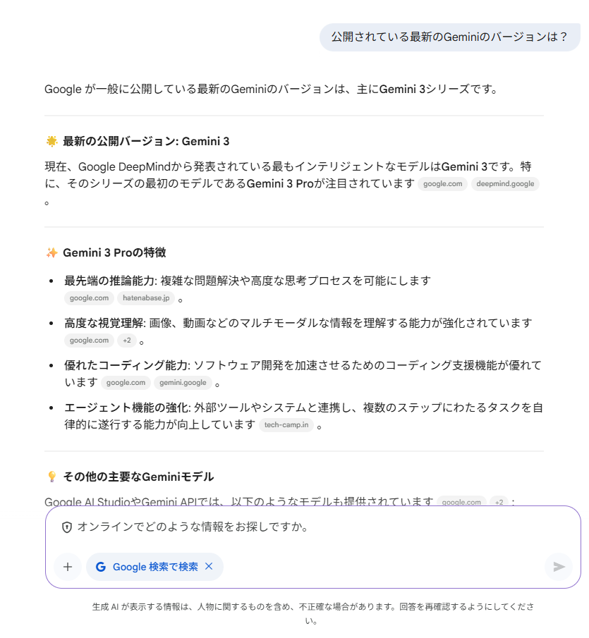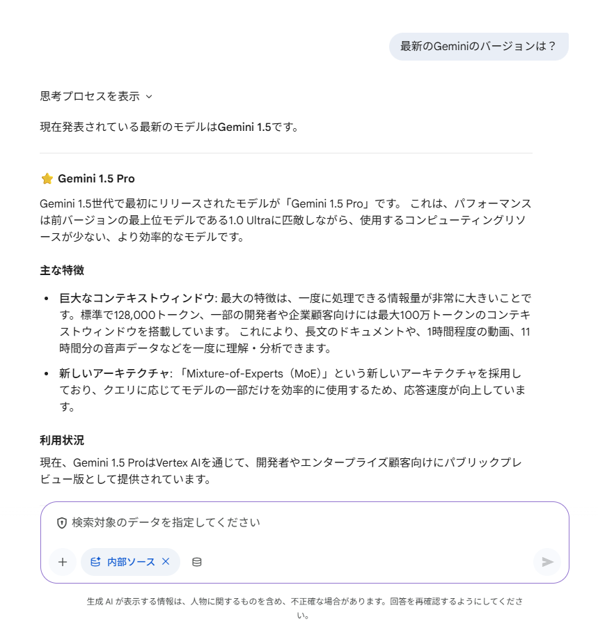 内部ソースを利用した検索だからか、Gemini1.5が最新のモデルだと生成されました。