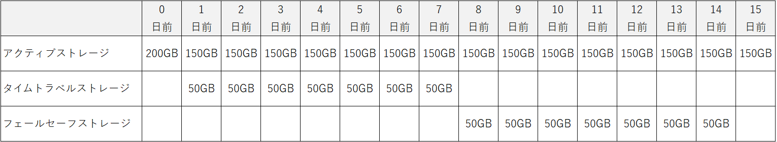 下記の表は、削除されたデータまたは変更されたデータがストレージ保持期間間でどのように移動するかを示しています。この例では、アクティブなストレージの合計が 200 GB で、50 GB が削除され、タイムトラベル ウィンドウが 7 日間に設定されています。