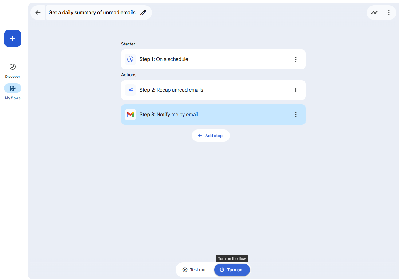完成したエージェントを起動(毎日動くように)するためには、画面下の「Turn on」ボタンを押します。これでエージェントが起動した状態になり、設定したタイミングで要約メールが送られてくるようになります。