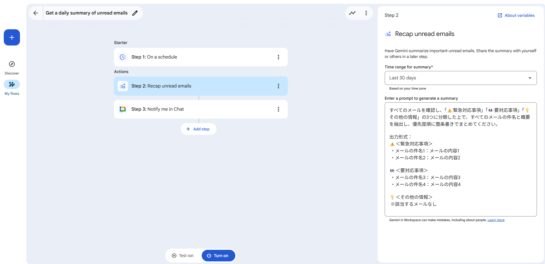 今回は、Google Workspace Studioを使用して、未読のメールを毎日1通にまとめて自動送信する方法をご紹介しました。