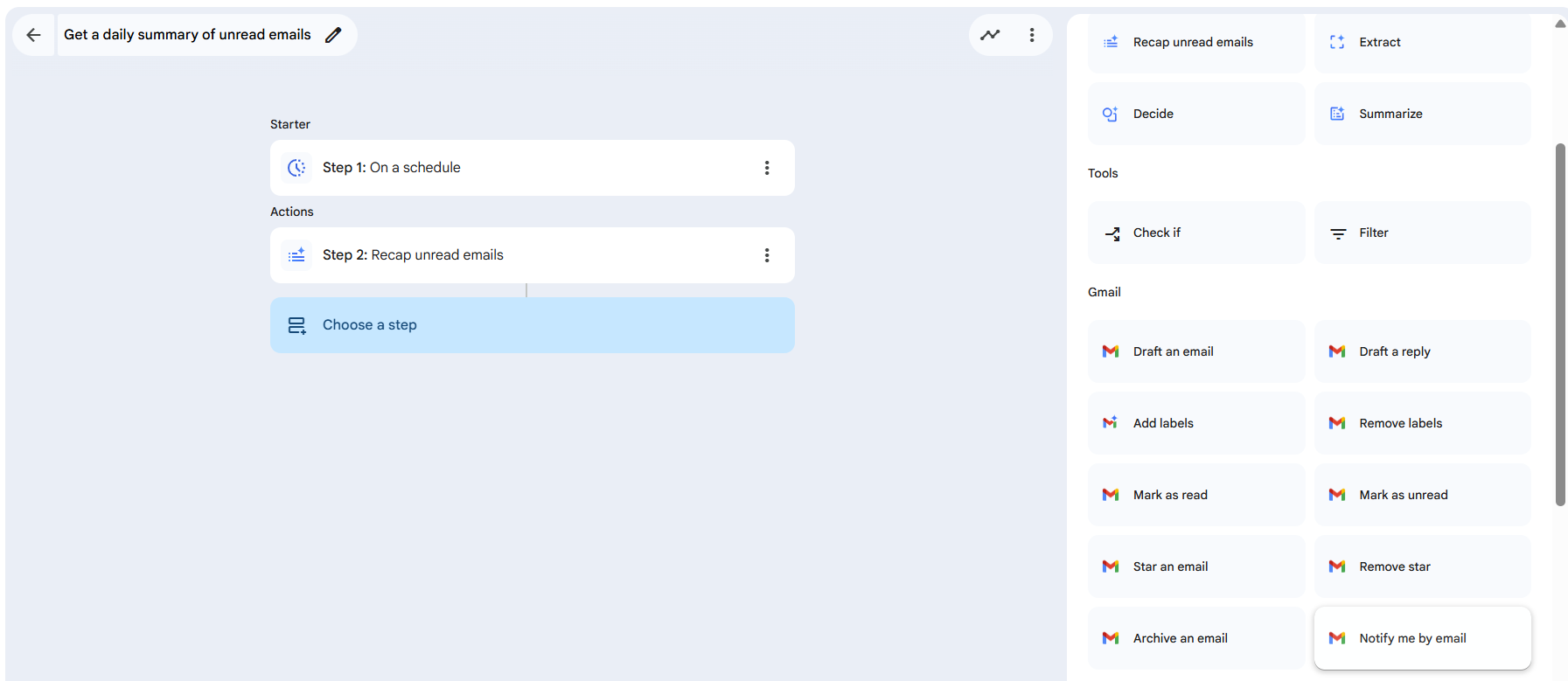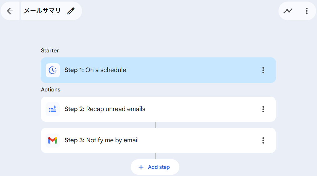 「Step 3 Notify me in Chat」のステップを設定すれば完成ですが、今回はメールで要約を送ってもらうようにカスタマイズしてみましょう。