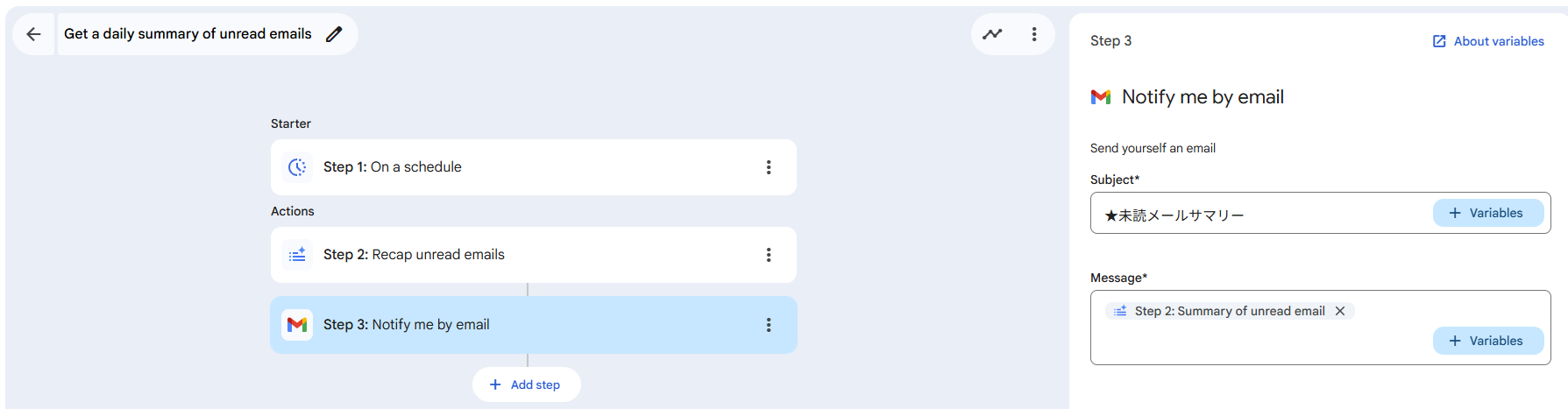 「+Variables」のボタン > 「Step 2:Recap unread emails」 > 「summary of unread email」を選択