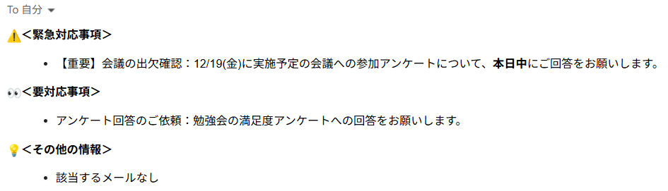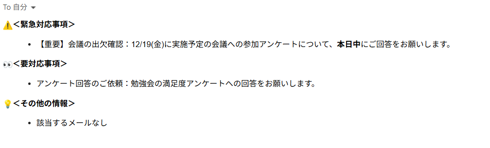 毎朝、1本の要約メールが自分宛に送信されるようにしています。未読かつ重要なメールのみをまとめて、優先度ごとにグルーピングしてもらっています。