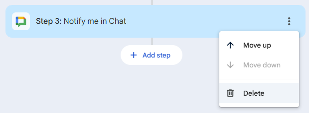 チャットのステップを選択して削除した後に、「Add step」のボタンから新しいステップ(Notify me by email)を追加してください。