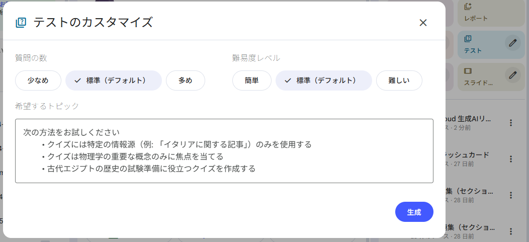 質の高い問題を作らせるには、具体的な指示が必要です。これは「テスト」ボタンの右肩の編集(鉛筆アイコン)ボタンから追加のプロンプトを指定できます。