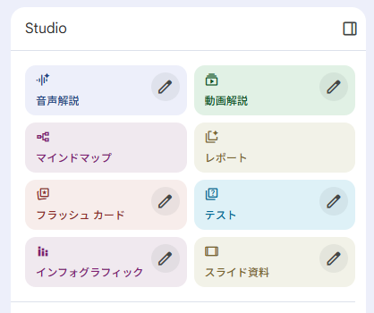 まずは、読み込んだ資料の要約を読んでみましょう。NotebookLMでは、2025年11月時点で以下イメージの様なコンテンツをクリックひとつで生成できる機能があります。