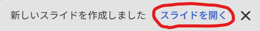 2.しばらくすると画面左に下記メッセージが表示されるので「スライドを開く」をクリックするとGoogle Slidesが起動します。