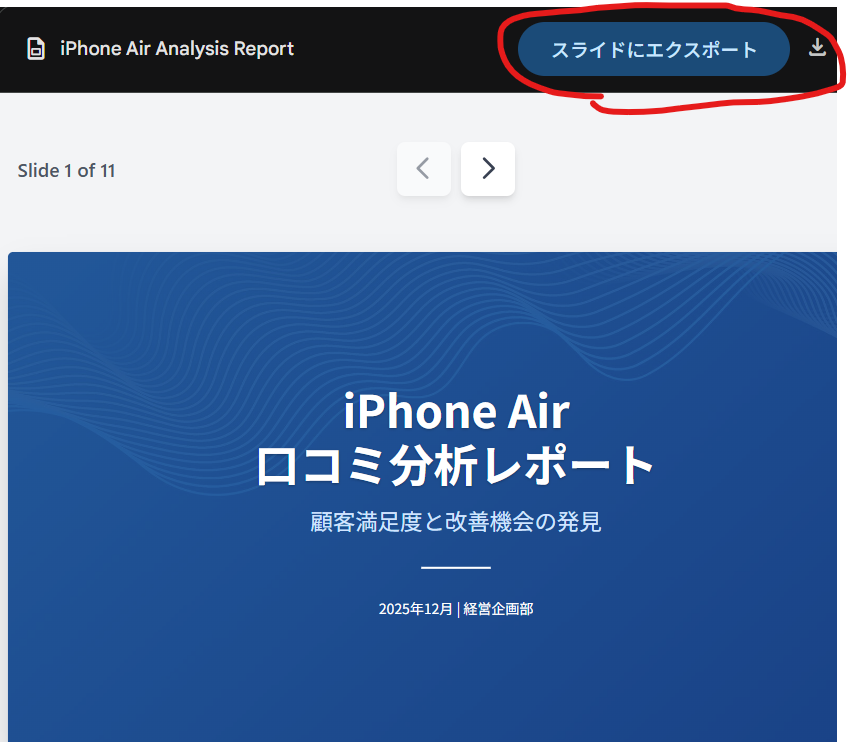 ここが最終段階です。作成したレポートをプレゼンテーション資料(Google Slides経由でPowerPoint形式にも出力可能)に自動変換します。