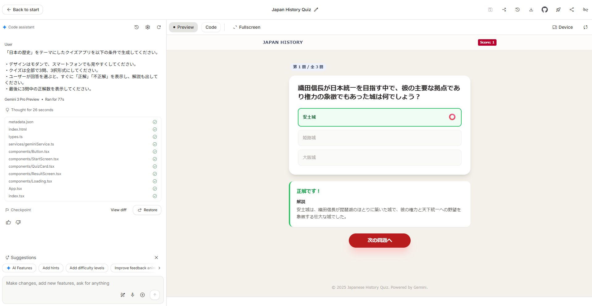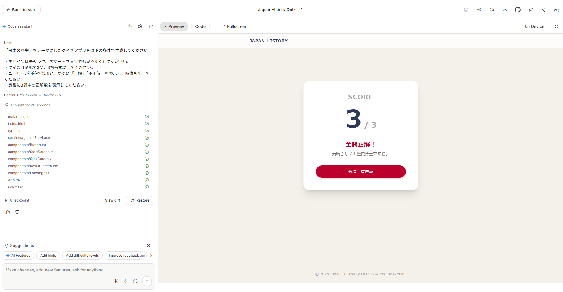 これまでの開発フローでは、コードを生成しても「環境構築」や「コピペ作業」という壁がありましたが、Google AI Studioを使えば、ブラウザひとつでアイデアを即座に動く形にできることがお分かりいただけたかと思います。