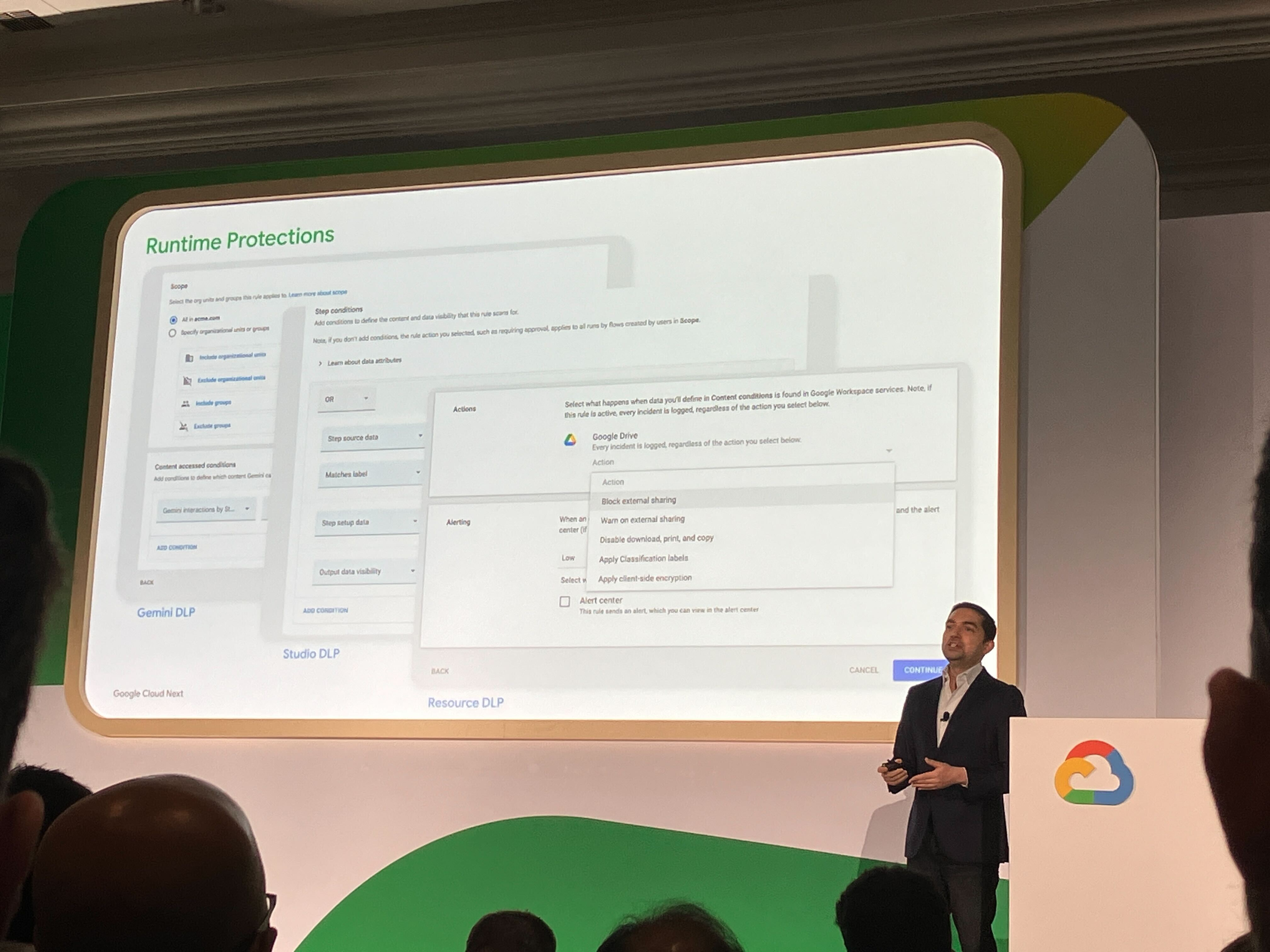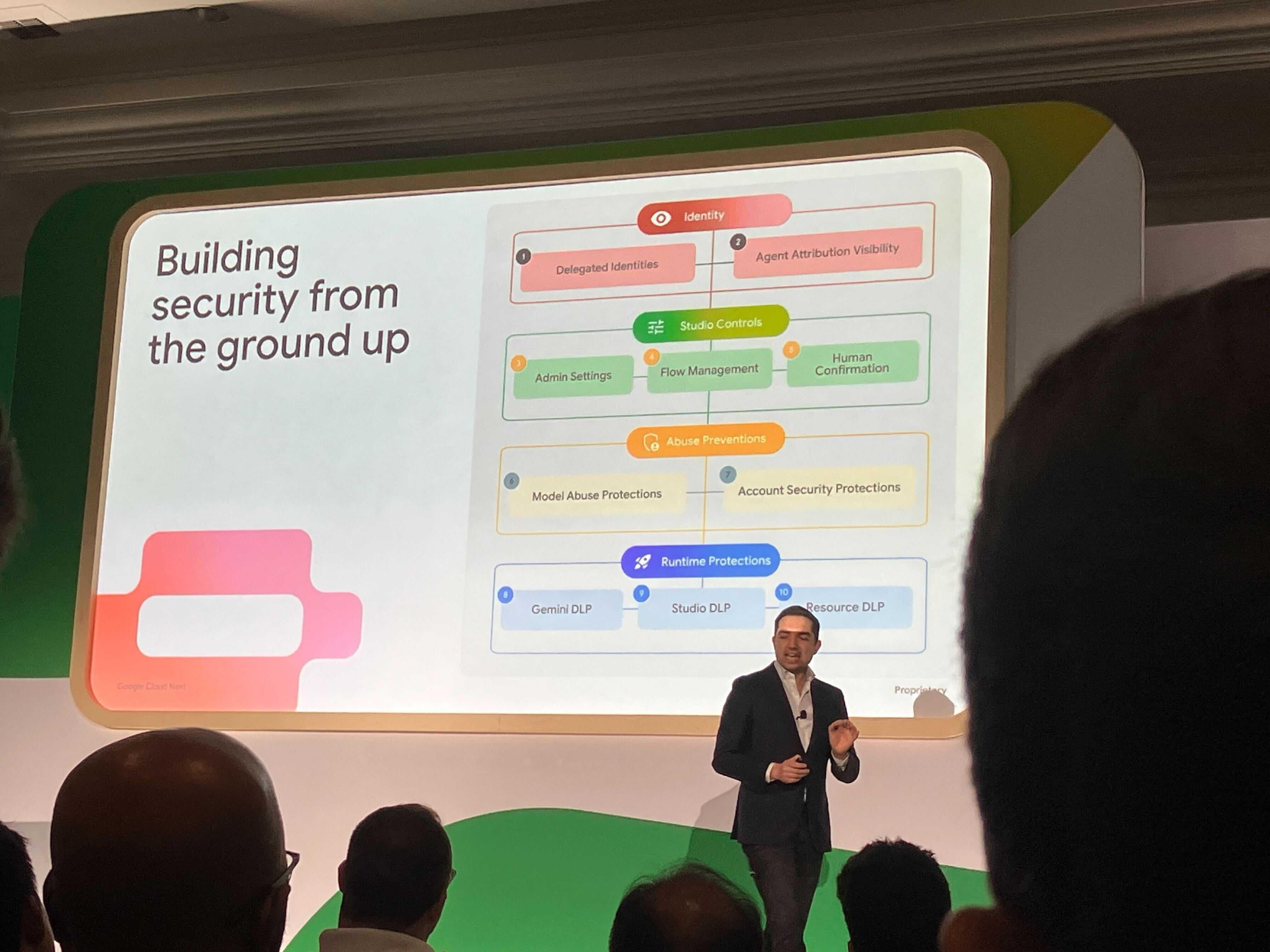 実行時の DLP は 3 層構造です。Gemini DLPは Gemini がアクセスできる Workspace データ(メール・チャットなど)を制限します。Studio DLP はフローが扱うコンテンツの機密度と情報の受け取り手を組み合わせたルールで制御します。Resource DLP は既存の DLP ルールを活用し、データが組織外に出ないよう最終ラインで防ぎます。「一つ前の層で見逃されても、次の層が補完する。最後の Resource DLP は、人間が誤って承認してしまったケースですら保護する」と Jakob 氏はまとめていました。
