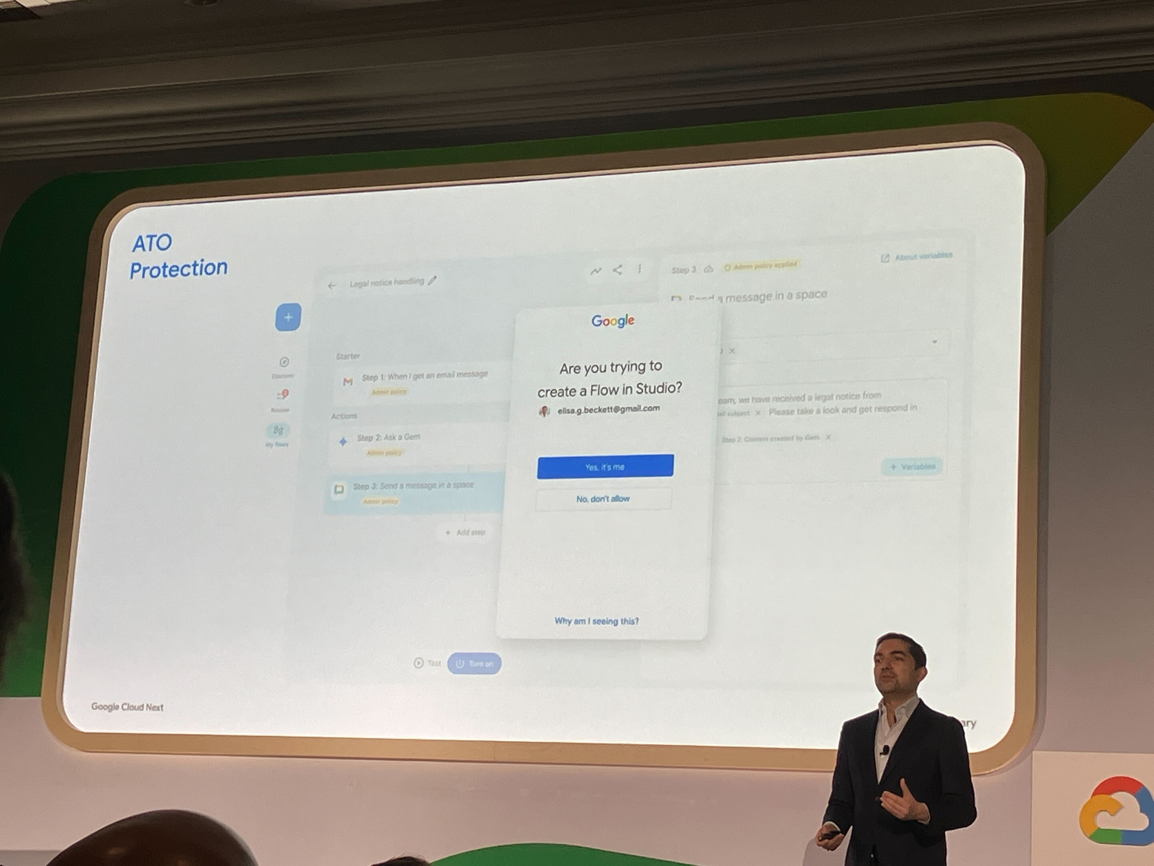 アカウント乗っ取り防止も追加されます。Google のヒューリスティクスで不審なアカウント状態を検知し、高リスクなフローを作成しようとした場合は再認証を要求します。「ユーザーがカフェで席を外した隙に別の人がノートパソコンを操作してフローを作ってしまう」というシナリオへの対策として紹介されていました。