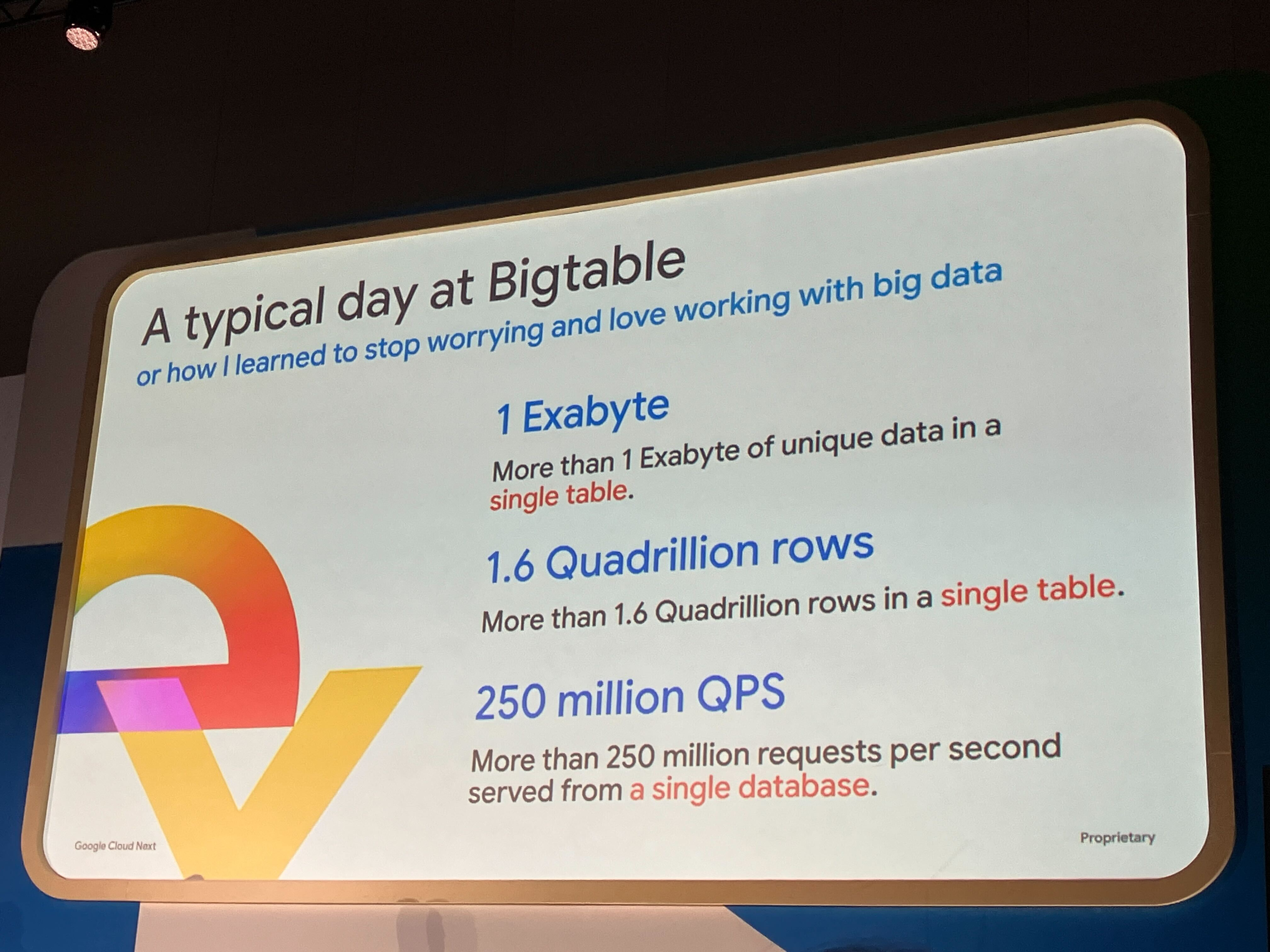登壇者は Bigtable を「Fast and flexible storage at scale」とシンプルに表現しました。Google 内部でも機械学習など多くのサービスで利用されており、Sundar Pichai 氏の基調講演でも言及されたとのことです。