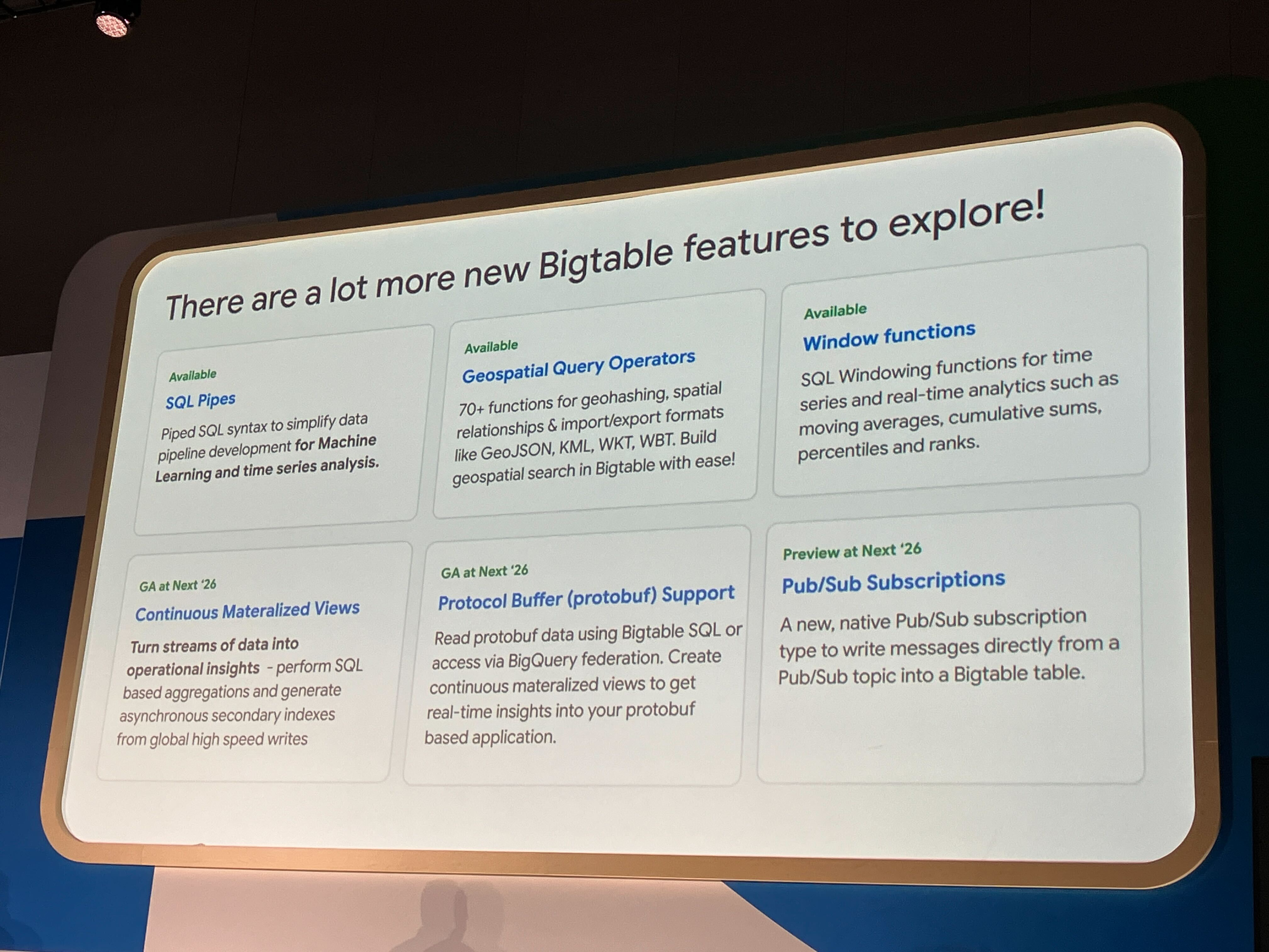 今年の Bigtable の開発速度は相当なものがあります。時系列関数の追加、70 以上の地理空間クエリ関数・オペレーター、Continuous Materialized Views(非同期セカンダリインデックスとしても利用可)、Pub/Sub との自動同期、BigQuery からの逆 ETL と、1 セッションで収まりきらないほどの数でした。
