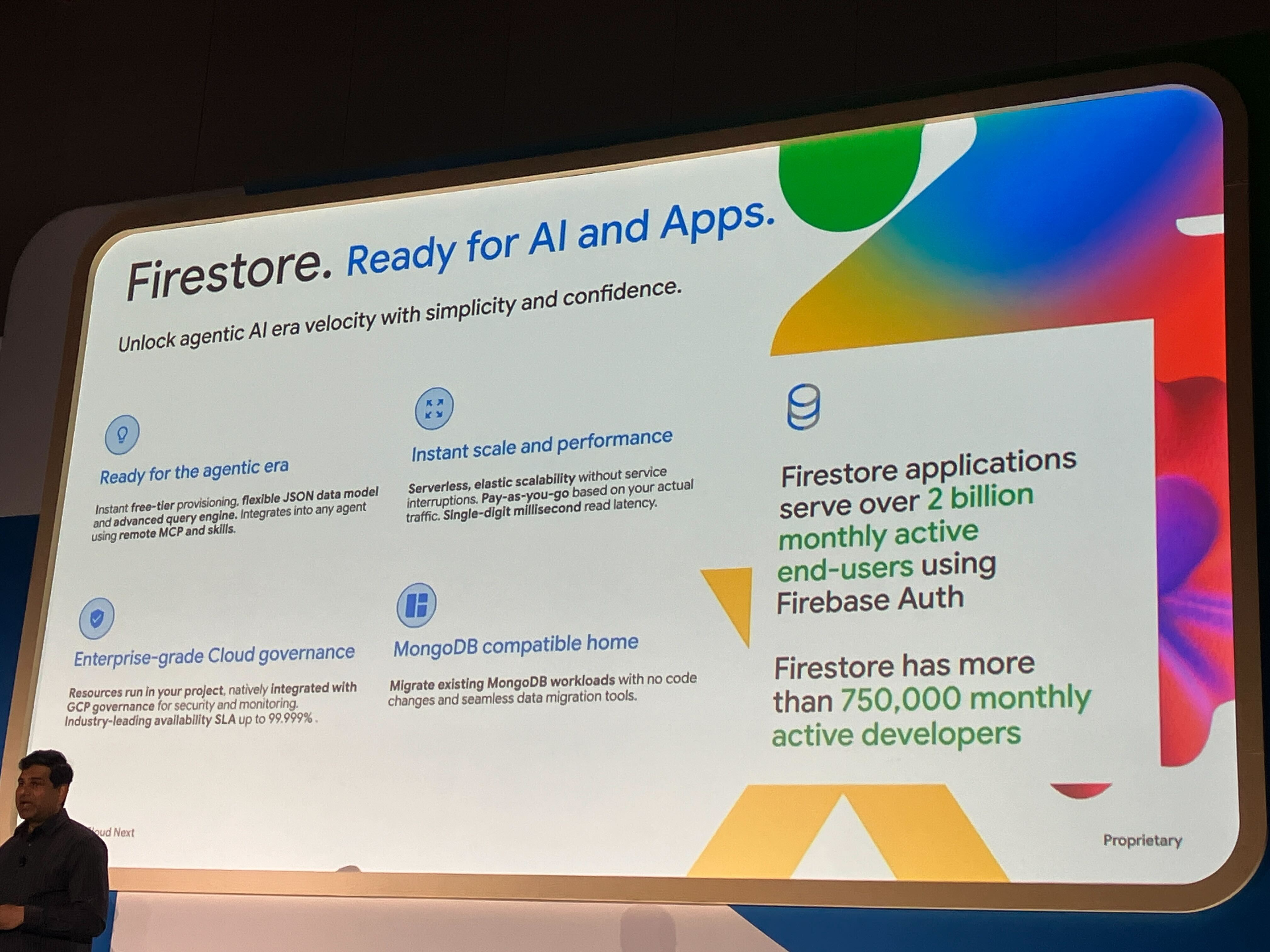 Firestore は「サーバーレスの企業向け JSON データベース」として、エンタープライズからモバイルアプリ、週末プロジェクトまで幅広い用途で使われています。20 億人のエンドユーザーを支えるアプリが Firestore 上で動作しており、アクティブな開発者数は 75 万人超とのことです。