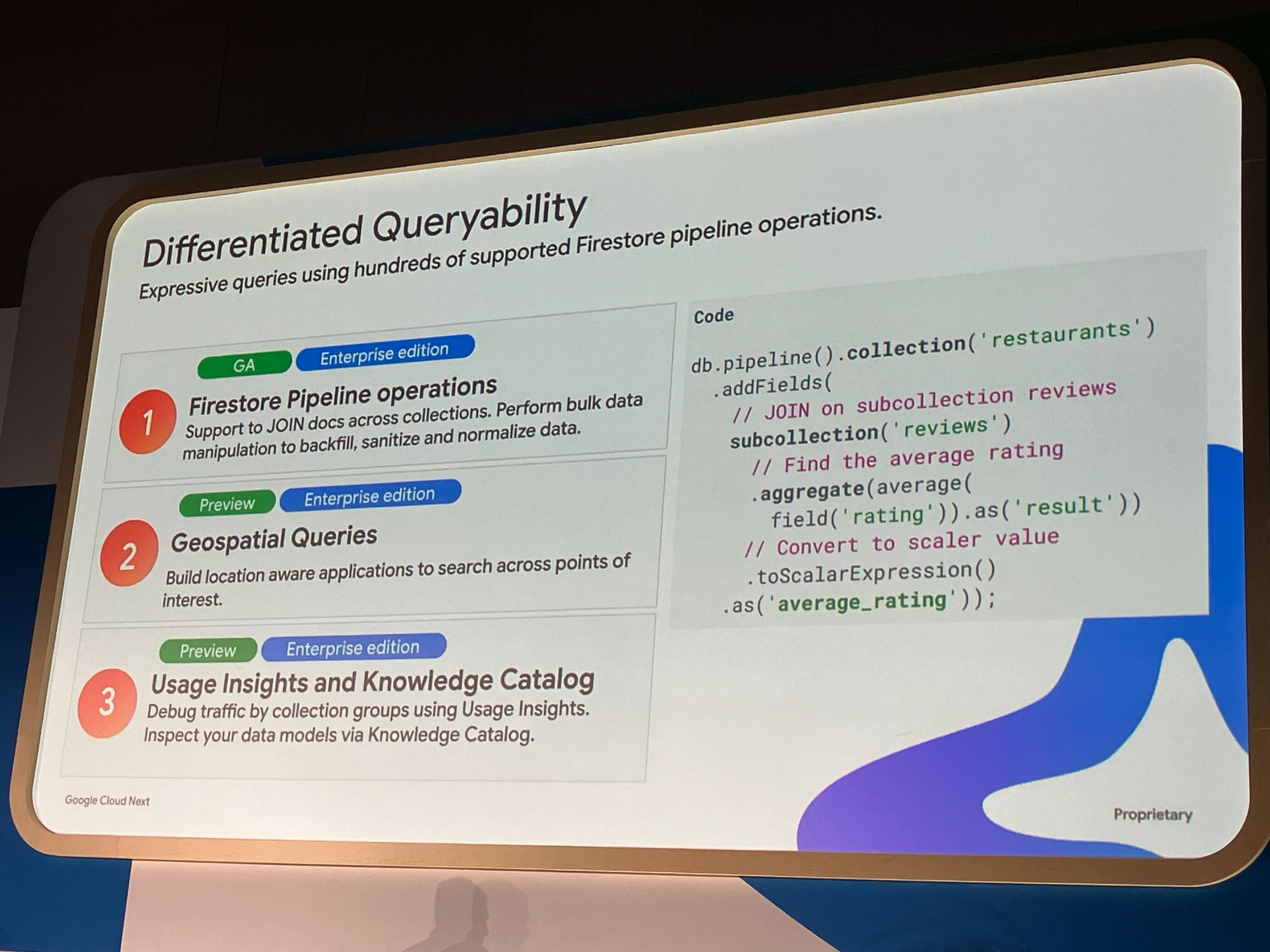 MongoDB 互換モードと並行して、Firestore ネイティブ API の Enterprise Edition も発表されました。パイプライン操作(JOIN・集計・バルク編集)、地理空間機能、Data Catalog 統合が追加されています。フルテキスト検索は MongoDB 互換モードとネイティブ API の両方で利用可能です。