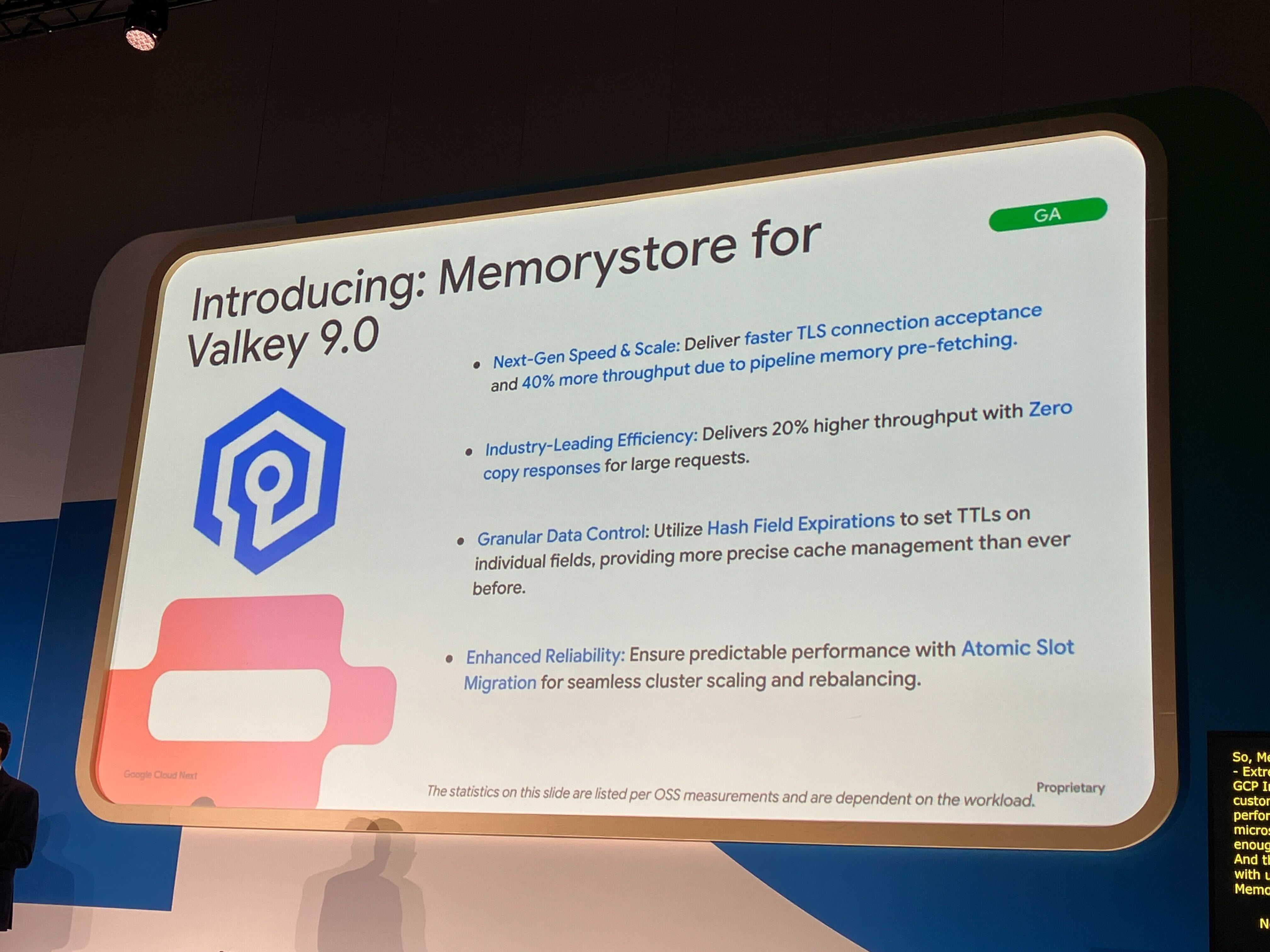 セッションでは Google Cloud のトップ顧客の 95% が利用しているという Memorystore の新機能がセッションの最初のトピックとしてスタートしました。マイクロ秒のレイテンシと 99.99 の可用性を維持しつつ、今回のアップデートで選択肢が大きく広がりました。