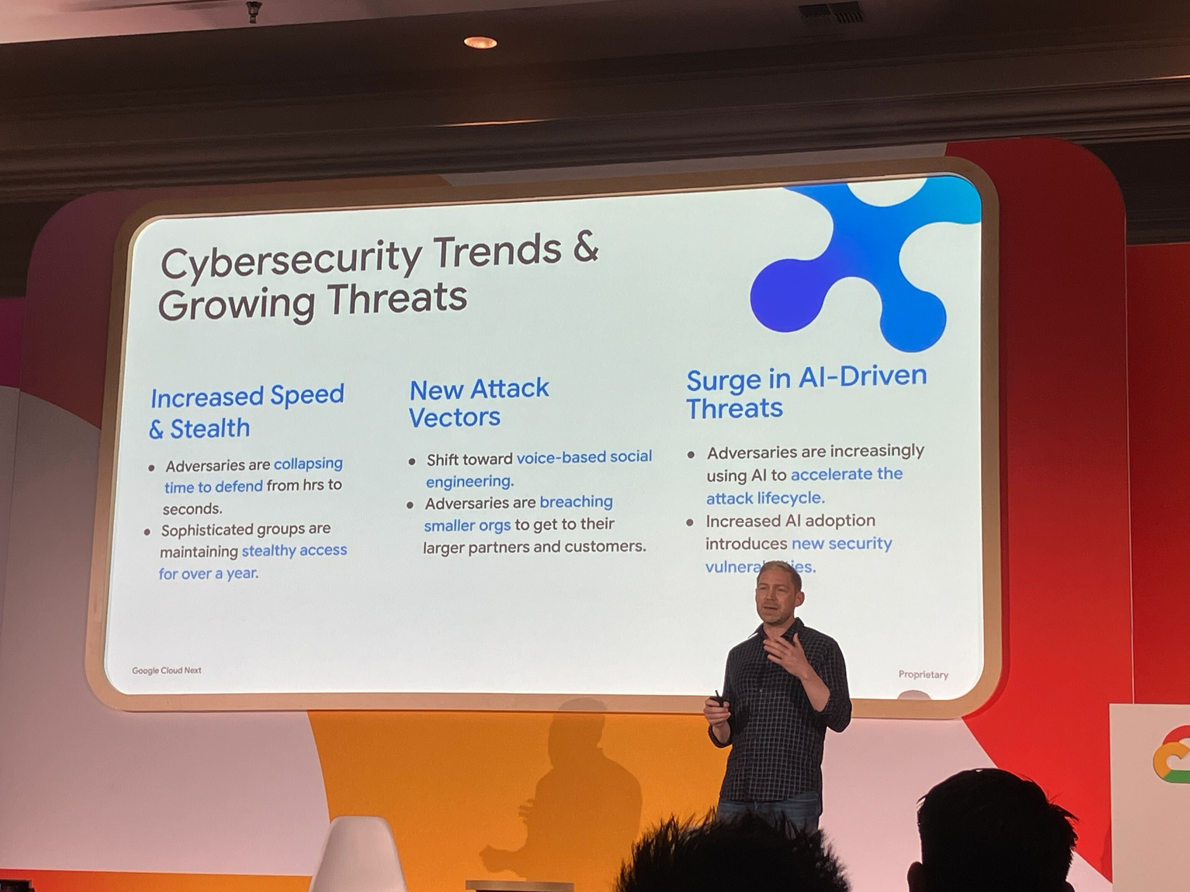 脅威アクターはすでに AI を使って攻撃ライフサイクルを自動・加速化しており、防御側の介入窓口は秒単位にまで縮小しています。高度な攻撃グループが 1 年以上ステルスで侵入を継続するケースもあるとのことでした。ヘルプデスクに電話して従業員を装い認証情報を詐取する音声ソーシャルエンジニアリングも増加傾向にあるとのこと。小規模な取引先を踏み台にして大企業へアクセスするサプライチェーン攻撃も増えています。さらに、プロンプトインジェクション攻撃が自律エージェントに適用され始めており、セキュリティポリシーをバイパスする用途に使われるリスクも出てきたと説明されていました。