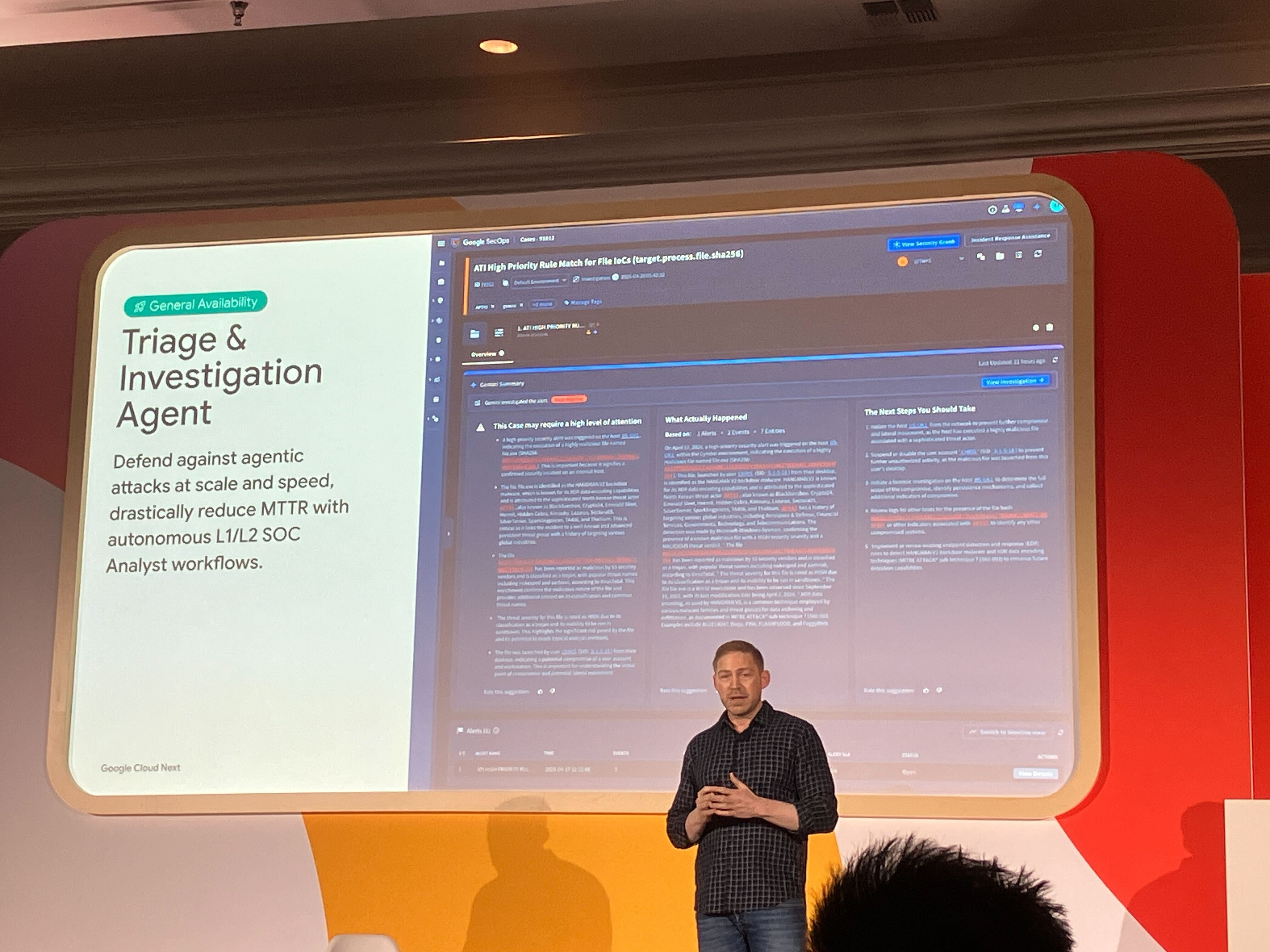 100 件以上のレポートを毎月届けていたため、以前は 3 日かかっていた作業が生成 AI により数分で生成できるようになったとのことです。Level 1 アナリストに対して Gemini が「Level 3 の知見」をリアルタイムで提供することで、上位エンジニアへのエスカレーションなしに判断できるケースが増えたと説明していました。