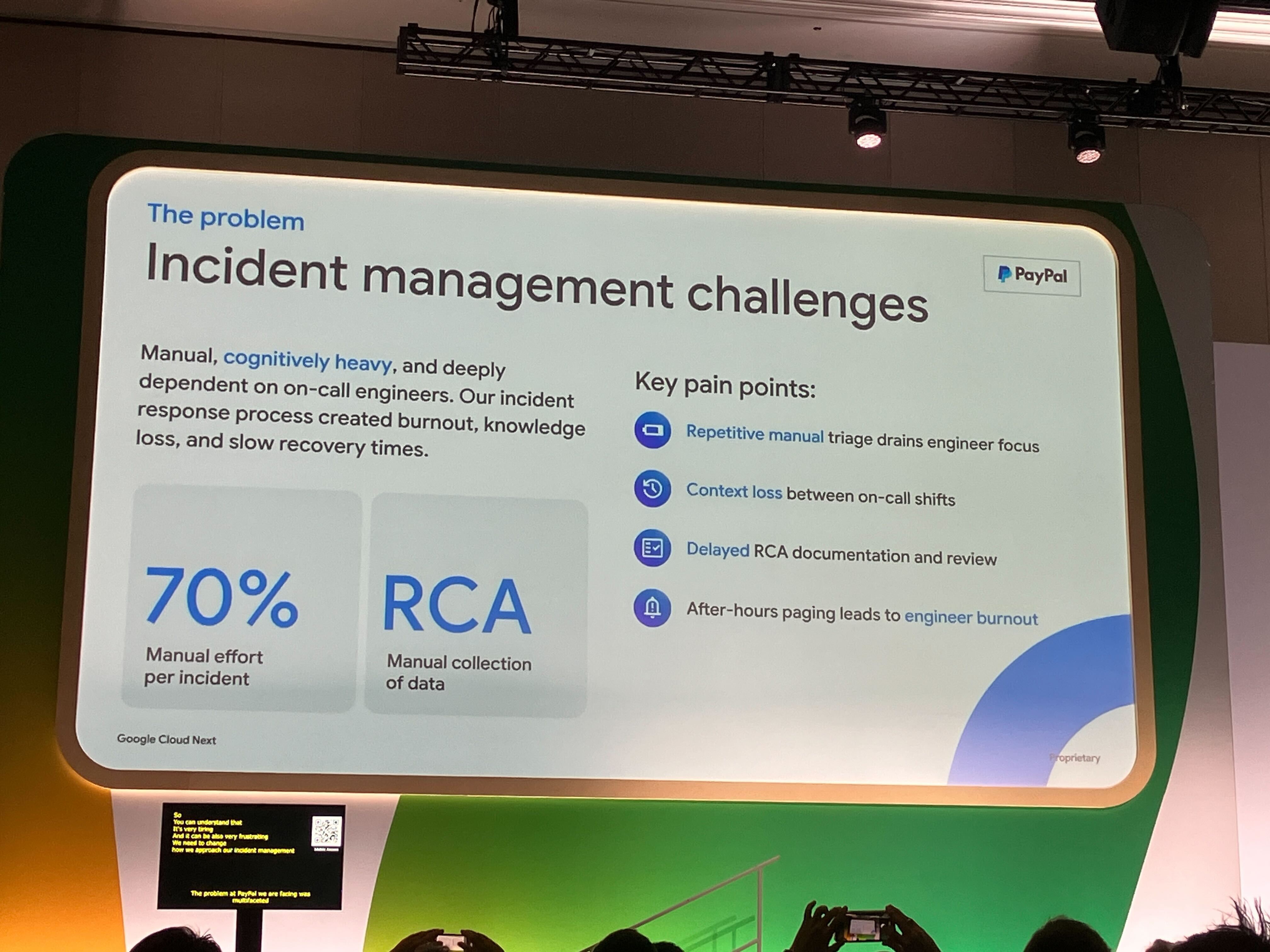 PayPal が直面していた課題は複合的なものでした。繰り返しの手動トリアージによる集中力の低下、オンコールシフト交代のたびに失われるコンテキスト、遅延する RCA ドキュメント、深夜対応による燃え尽き。そして最も大きかったのは、インシデント対応の 70% の労力がデータ収集と手動での相関分析に費やされていたことです。