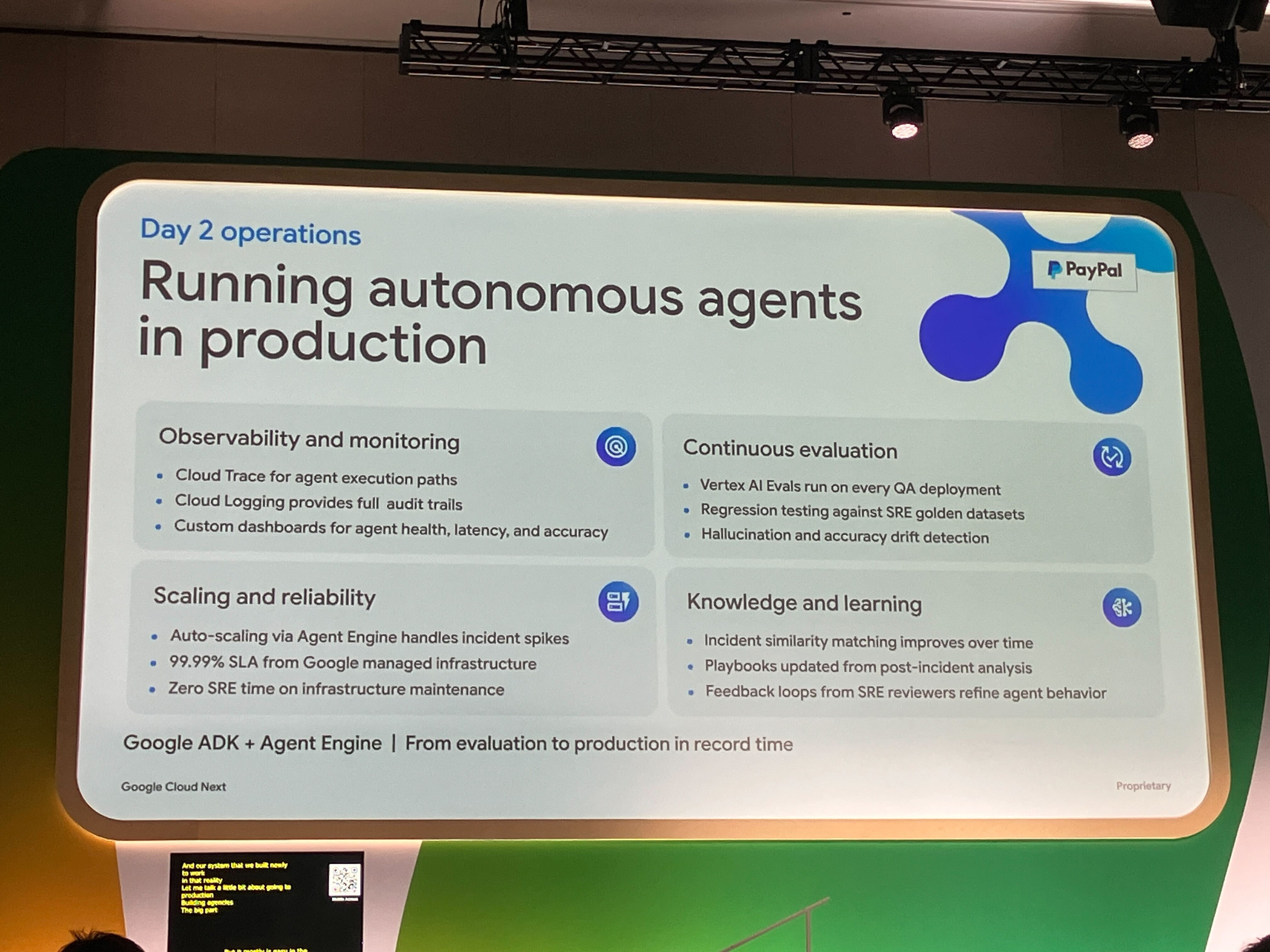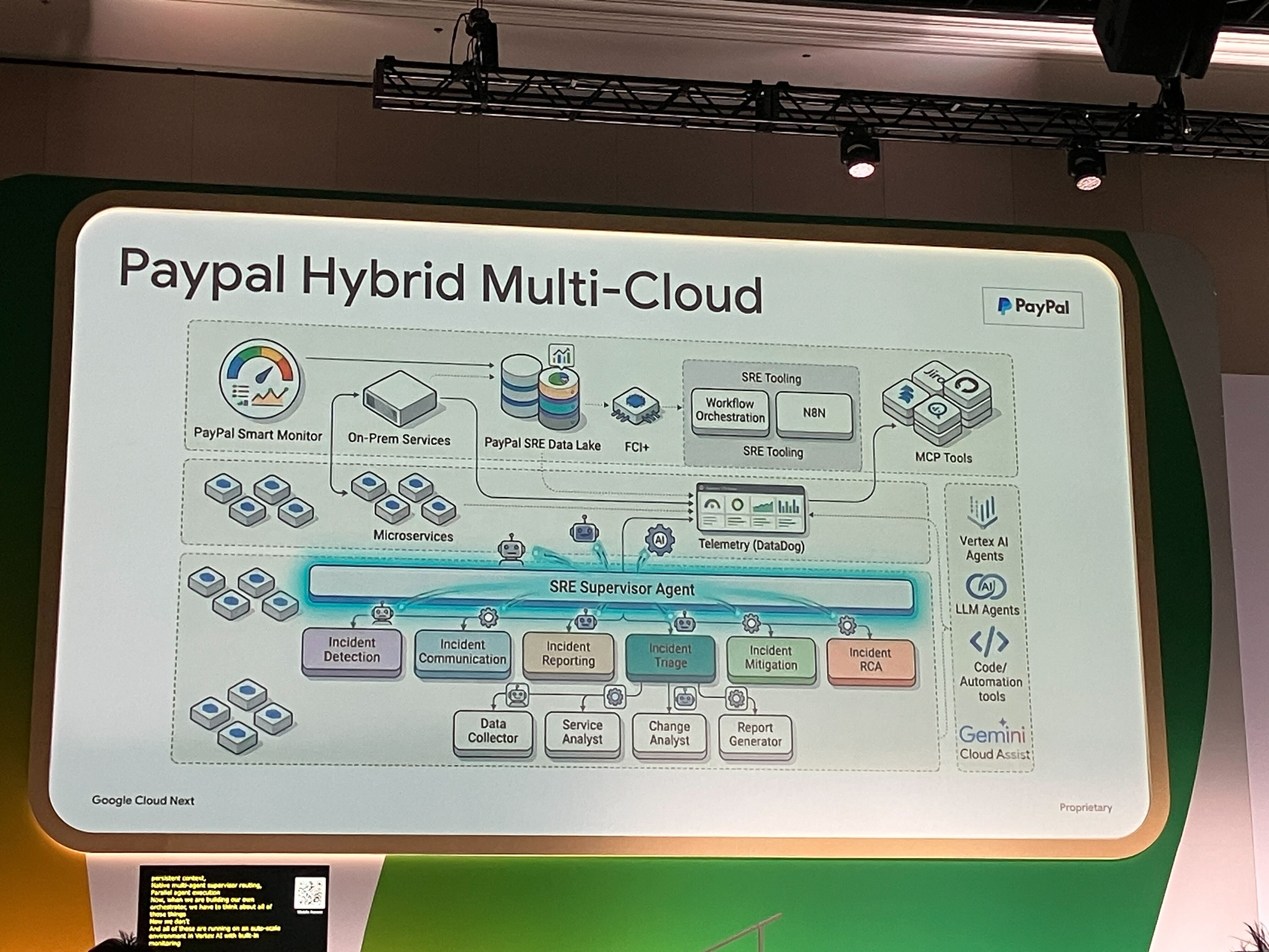 - グローバル決済業界のリーダー企業は、コードスピードでインシデントにどのように対応しているのでしょうか?このセッションでは、PayPalがGemini Enterprise Agent Platform上のAgent Runtimeを使用して、自律的なサイト信頼性エンジニアリング(SRE)エージェントプラットフォームを構築し、拡張した方法をご紹介します。PayPalのアーキテクチャは、本番環境のオブザーバビリティスタックと直接統合され、インシデントの検出、分析、解決を行います。このシステムによって、平均修復時間(MTTR)と手作業に費やす総時間の両方を大幅に削減できた経緯を解説します。マルチエージェントループのアーキテクチャから、大規模な自律的修復に必要なガバナンスまで、本番環境における導入プロセスを詳しく見ていきます。