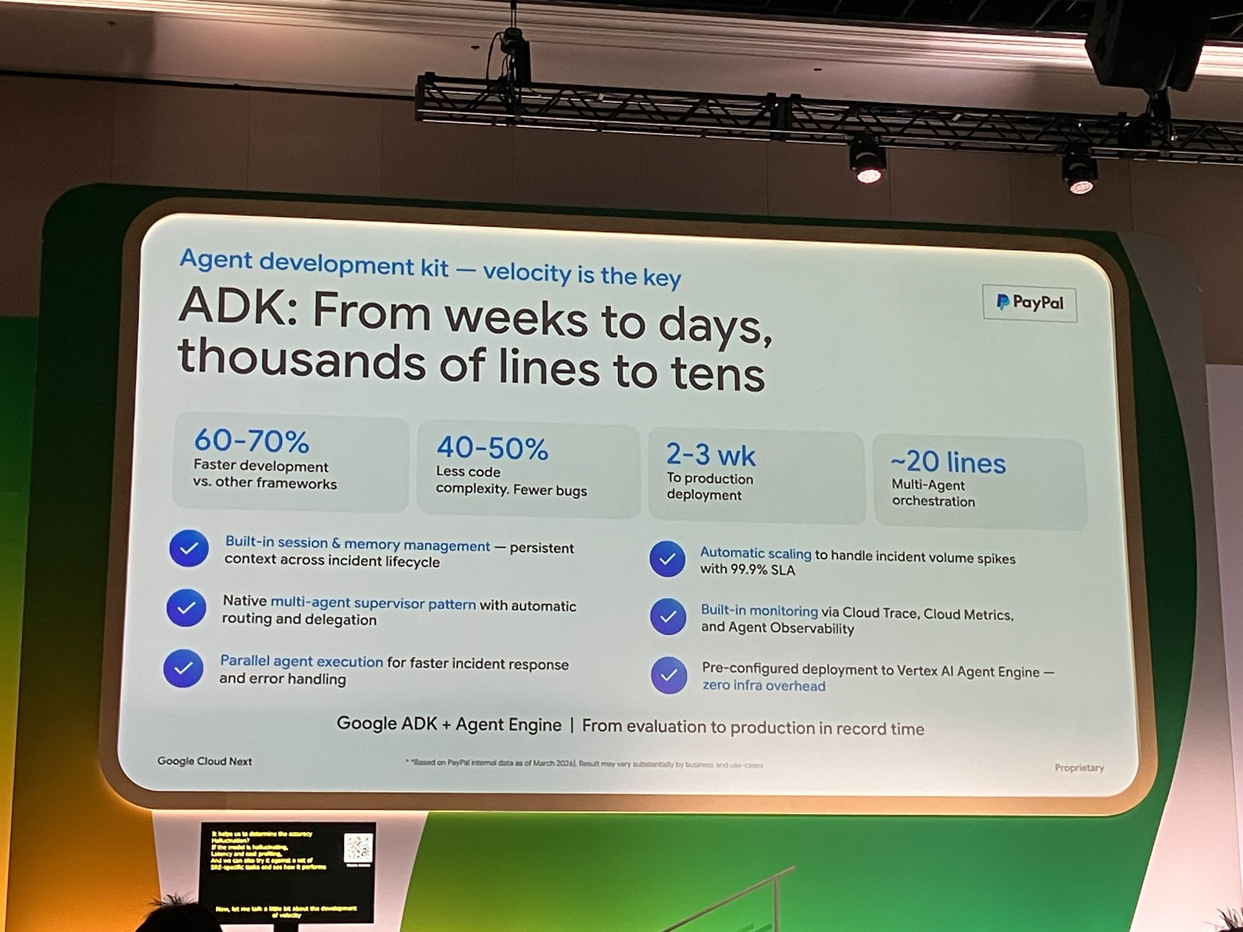 - ADK と Agent Platform(旧Vertex AI) の組み合わせが本番環境へのデプロイのハードルを下げた: 開発時間 60〜70% 削減・POC から本番 2〜3 週間という数字は、ゼロベースでフレームワークを構築した経験があるチームならより実感できるはずです。セッション・メモリ・マルチエージェントルーティングが組み込みで使えることの価値は大きいと感じました