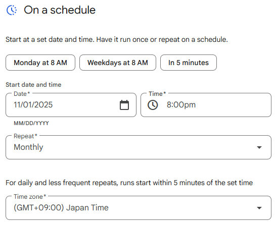 Starterで「On a schedule」を選択して、Dateには月初の日付、Timeには「8:00am」を選択します。そして、毎月実行するようにしたいのでRepeatには「Monthly」を入れるようにしました。Time zoneも設定できますがデフォルトの日本時間となるようにしています。