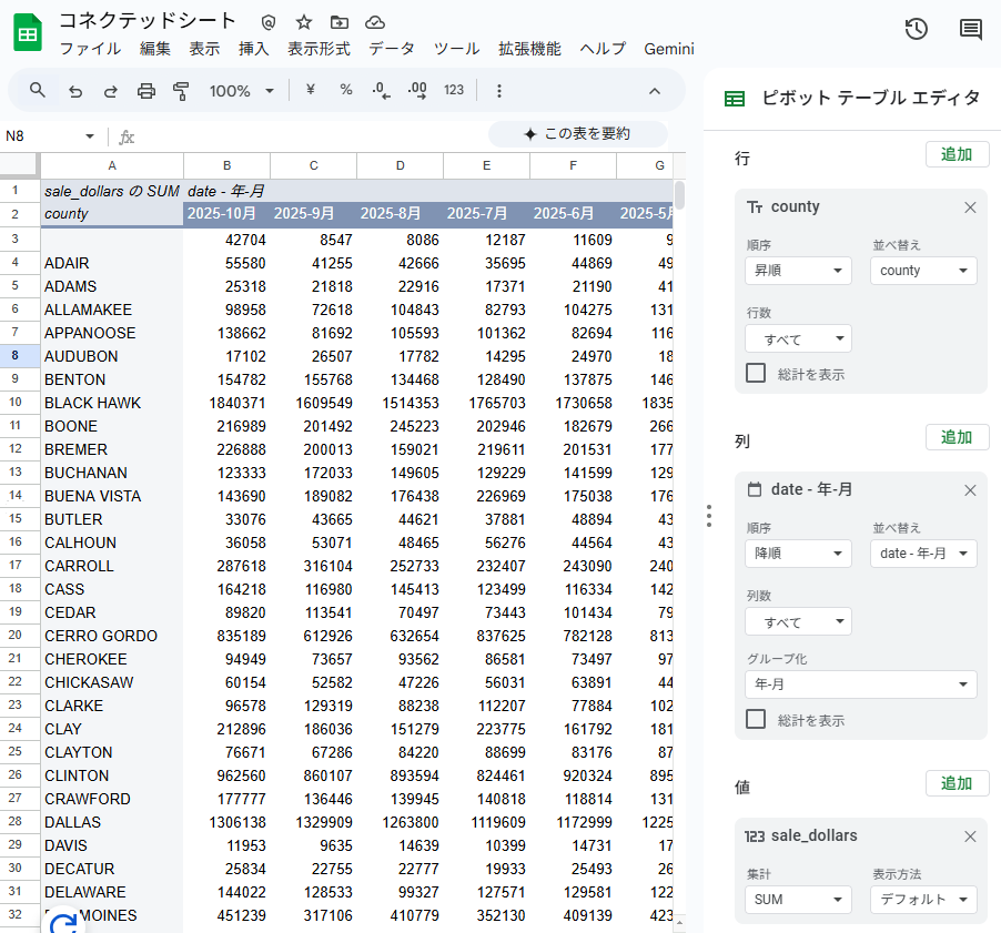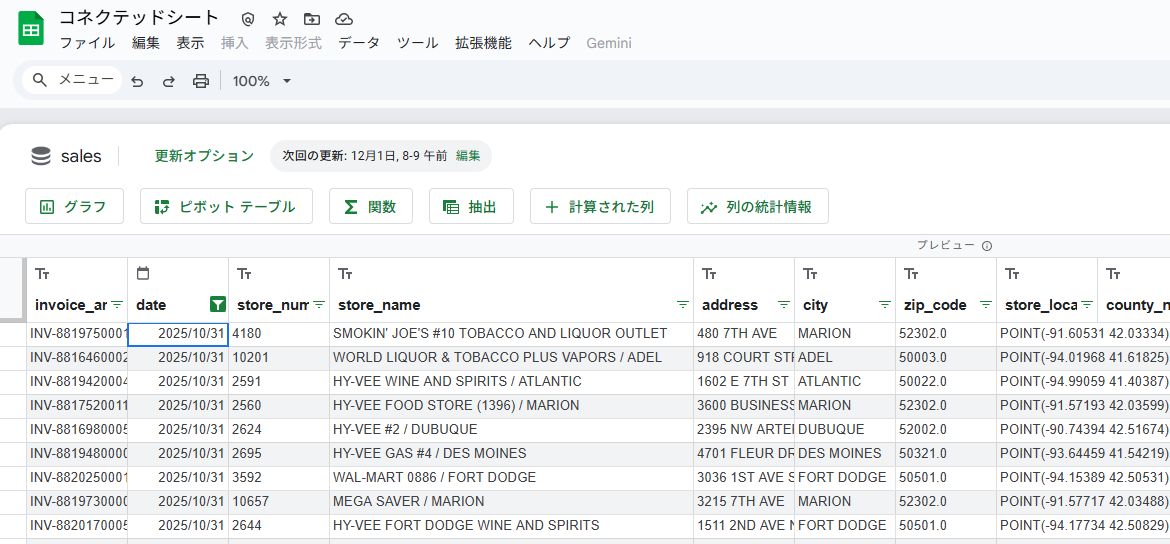 今回のブログではBigQueryやコネクテッドシートについて詳しく説明することはしません。BigQueryに接続する権限についてはすでに持っていることやコネクテッドシートの作成方法はすでにご存じであることを前提にして、以下のテーブルに接続したスプレッドシートを準備してください。