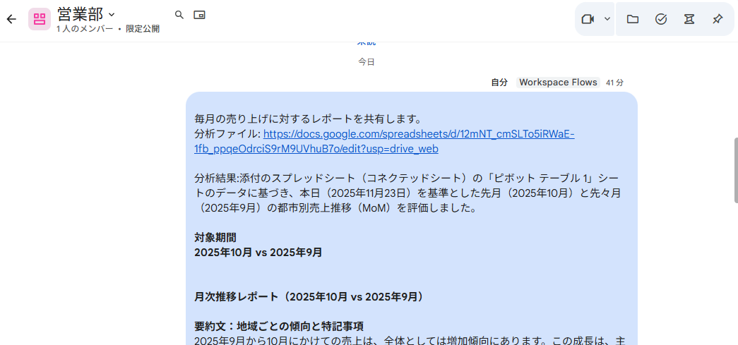 テスト実行した結果、営業部のChatスペースにMoMレポートの内容が連携されてきました。