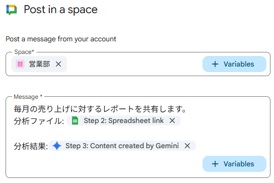 最後のActionsでは「Post in a space」を選択して、Spaceの欄には今回用に作成した「営業部」のスペースを追加し、Messageの欄に以下のプロンプトを入力してください。[]で囲まれている内容はVariablesから設定するようにしてください。