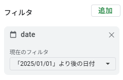 そして、このシートをもとにしたピボットテーブルを作成してください。見切れていますがフィルタの設定で、dateを基準に2025年1月1日以降のデータのみに絞っています。