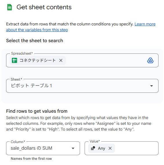 最初のActionsでは「Get sheet contents」を選択して、Spreadsheetの欄ではGoogle Driveのアイコンを選択して売上の情報を格納しているファイルを選択します。そして、Sheetには各月の売り上げのピボットテーブルのシートを選択します。(今回はピボットテーブル1に取得しているのでピボットテーブル1を選択しました。)