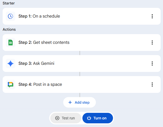 続くアクションでは、まず「Get sheet contents」により売上情報を取得しているスプレッドシートに接続して情報を取得します。そして、Geminiの「Ask Gemini」ステップで売上情報を分析するレポートを作成します。そして、その後に結果を「Post in a space」ステップで営業部のGoogle Chatスペースへ連携するような作りとしています。