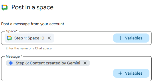 最後のPost in a spaceステップでは、ここまでのステップの結果を返すようにします。Spaceには受け取ったChatのスペースへ返信するため、VariablesからStep1:Space IDを設定します。MessageにはVariablesからStep6: Content created by Geminiを設定します。
