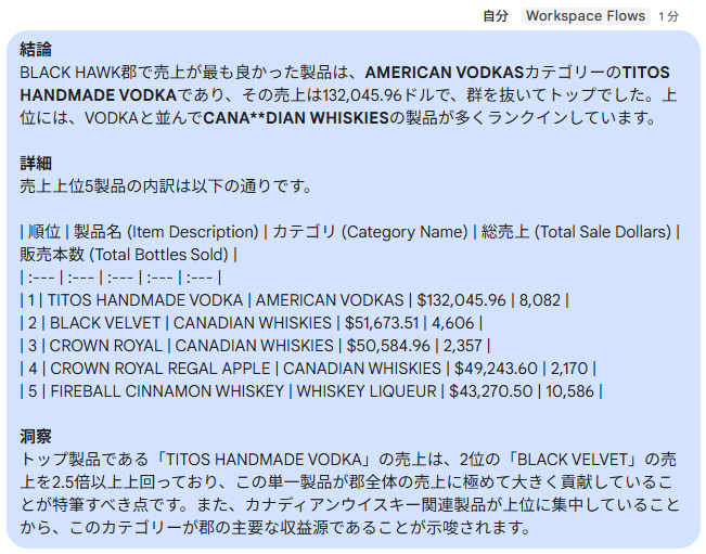 そうすると1分くらいで以下回答が出てきました。まだ不安定のため回答が出てこないこともありますが、プロンプトの調整をすることで改良していくことができると考えています。