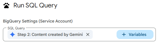次のRun SQL Queryステップでは、GASからインストールした独自のステップを実行する必要があります。ステップの中からBigQuery Runnerの欄にあるRun SQL Queryを選択してください。そして、SQL Queryの欄にVariablesから「Step2: Content created by Gemini」を設定してください。