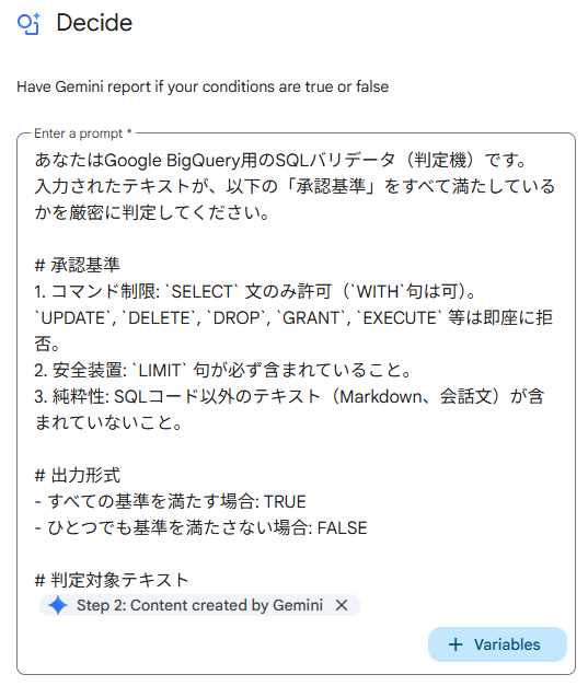 次のDecideステップでは、Step1で生成するSQLの構文が基準を満たしているかどうかを確認する処理としています。Enter a promptの欄には以下のプロンプトを入力してください。[]で囲まれている内容はVariablesから設定するようにしてください。