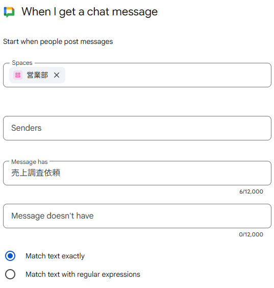 Starterで「When I get a chat message」を選択します、そして、Spacesには「営業部」、Message hasには特定の文言を検知するようにしたいため「売上調査依頼」を入力し、それ以外の項目はデフォルトのままとしました。