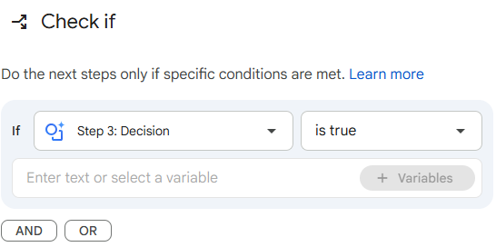 次のCheck ifステップではStep3の判定結果を確認します。以下の画像のようにStep3: Decisionがis trueという設定になっていることを確認してください。