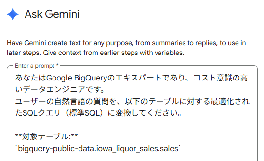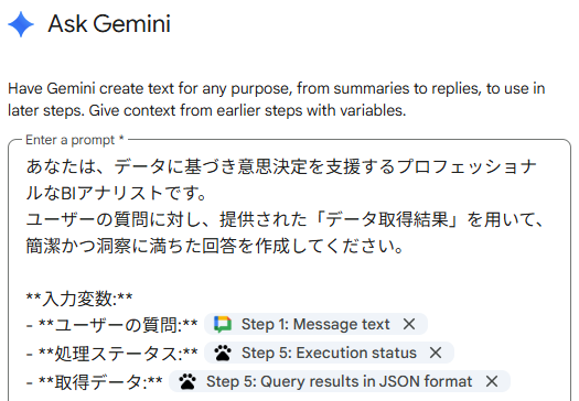 そして、SQLを実行した後の内容をもとにした分析結果を生成するステップとなる「Ask Gemini」のステップを作成します。Enter a promptの欄には以下のプロンプトを入力してください。[]で囲まれている内容はVariablesから設定するようにしてください。