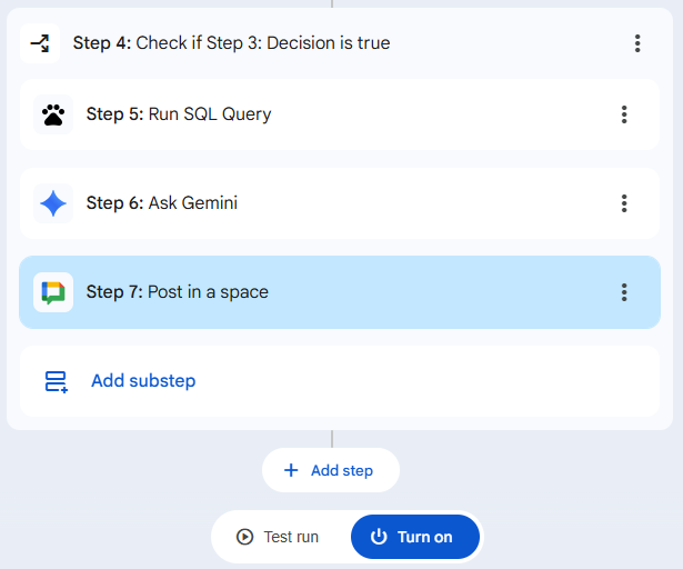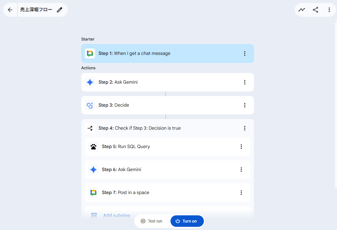 続くアクションでは、まず「Ask Gemini」ステップでBigQueryに存在している売上情報のテーブルに対して実行するSQLを発行し、その結果を「Decide」ステップで正しいSQL構文となっているかの判定処理を実行します。そして、「Check if」ステップで正しいSQL構文であることを確認してから、GASで構築した「Run SQL Query」ステップでSQLを実行し、さらに「Ask Gemini」ステップでSQLの実行結果をもとにしたインサイトを生成し、「Post in a space」ステップで分析結果を連携するような作りとなっています。