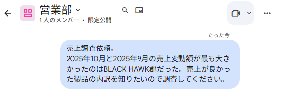 そして、営業部のChatスペースで売り上げの調査依頼を出してみます。Chatに「売上調査依頼。2025年10月と2025年9月の売上変動額が最も大きかったのはBLACK HAWK郡だった。売上が良かった製品の内訳を知りたいので調査してください。」と入力してみました。