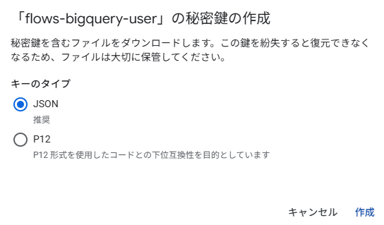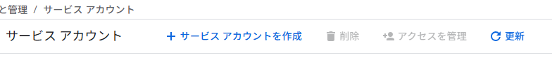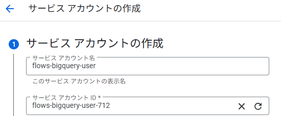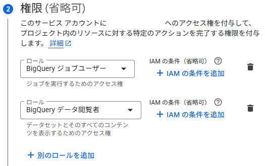 まずはGoogle Cloudのサービスアカウントを作成するサイトにアクセスしてください。そして、今回の実行するプロジェクトを選択して、画面上部の「サービスアカウントを作成」のボタンを選択し、適当な名前のサービスアカウントを作成してください。この時に権限を付与することを省略もできますが、今回は省略せずに「BigQueryジョブユーザー」と「BigQueryデータ閲覧者」を付与するようにしてください。