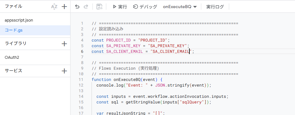 そして、コードの冒頭にある設定読み込みのところをGoogle Cloudで発行したサービスアカウントキーの中の情報に置き換えてください。