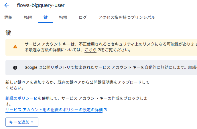 作成したサービスアカウントの詳細画面にアクセスして「キーを追加」ボタンからJSON形式のサービスアカウントキーを作成してください。