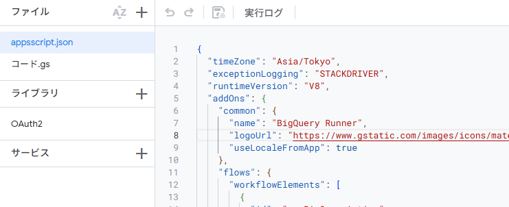 設定が完了したらエディタの画面に戻ってください。そして、ファイルの中の「appsscript.json」ファイルを選択して、エディタに以下の内容を入力して保存してください。保存した後にライブラリのところにOAuth2が出てきていれば大丈夫です。