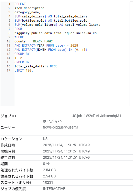 BigQuery側では実行履歴を確認することでどのようなSQLが実行されたのかやどれくらいの処理量となったかを確認することが可能となっています。