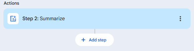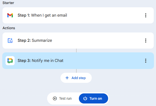 続くアクションでは、まずGeminiの「Summarize」ステップでメール本文を要約し、その結果をもとに「Notify me in Chat」ステップでGoogle Chatへ通知を送ります。
