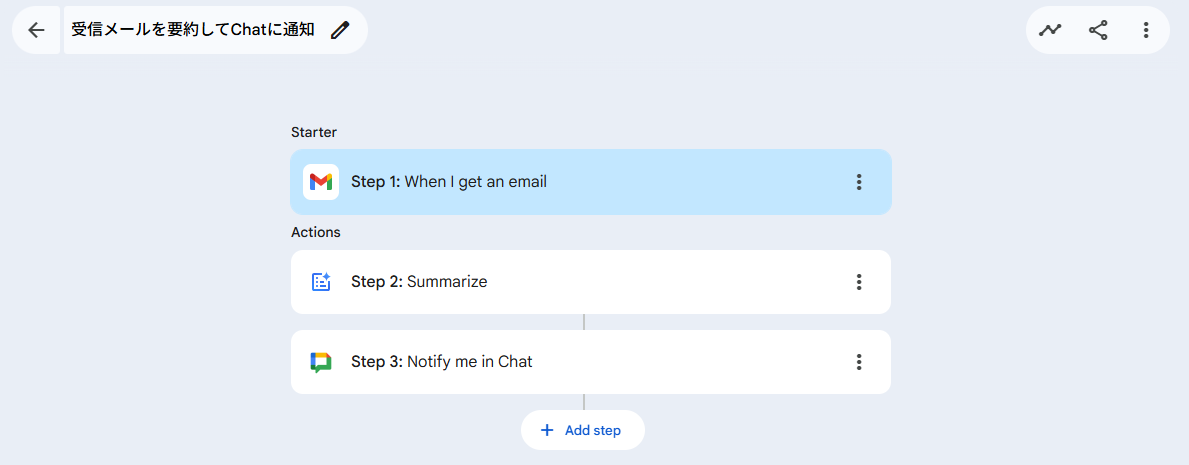 メール受信 → 要約 → Chat通知というシンプルな3ステップ構成です。