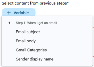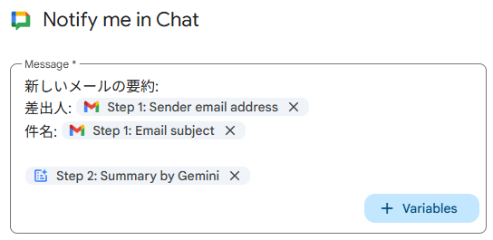 次に、Messageの欄にはChatへ転送する内容を設定します。具体的には、VariablesからStep1で取得した受信メールの差出人と件名を挿入し、さらにStep2で作成した要約文をメッセージの末尾に追加することで、Google Chatに情報がまとまって送信されるように構成します。