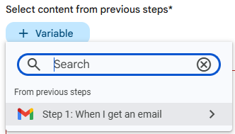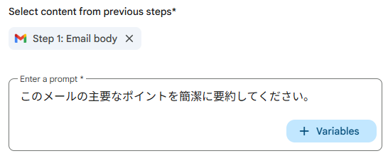 そして、Select content from previous stepsのVariableのボタンを選択して、Step1のStarterで設定した「When I get an email」の内容となる「Email body」を選択します。そして、Enter a promptの欄に「このメールの主要なポイントを簡潔に要約してください。」と記載します。